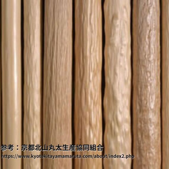 北山杉は、主に京都市北部から産出される杉の一種で、特に磨丸太(みがきまるた)として知られています。室町時代から茶室や数寄屋の建築用材として重用され、特に桂離宮や修学院離宮などの著名な建築に使用されています。